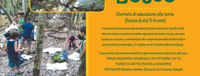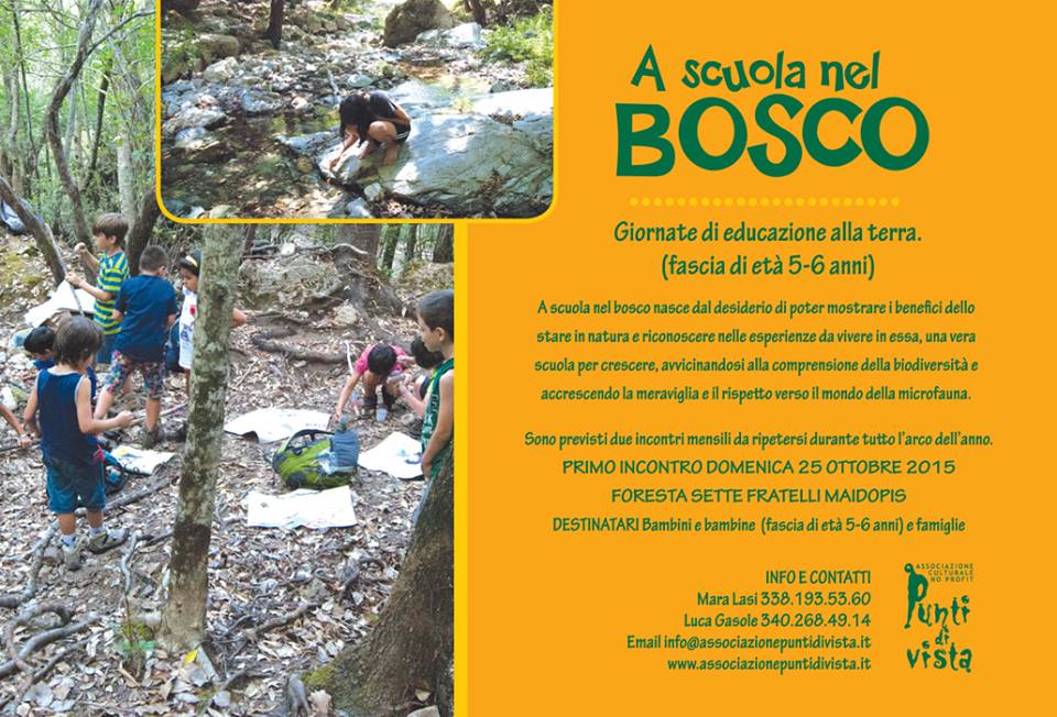 A scuola nel bosco è un progetto pensato per portare i bambini e le famiglie in foresta, organizzato dall’ass. cult. Punti di vista. I ragazzi dell’associazione annunciano così questo loro bellissimo progetto: “Iniziamo in autunno perchè ci piacciono i colori e i profumi di questa stagione, la pioggia non ci spaventa ma rende i colori ancora più vivi, l’aria è fresca e sana”.